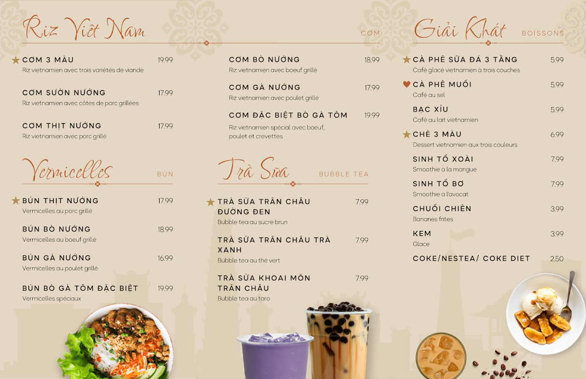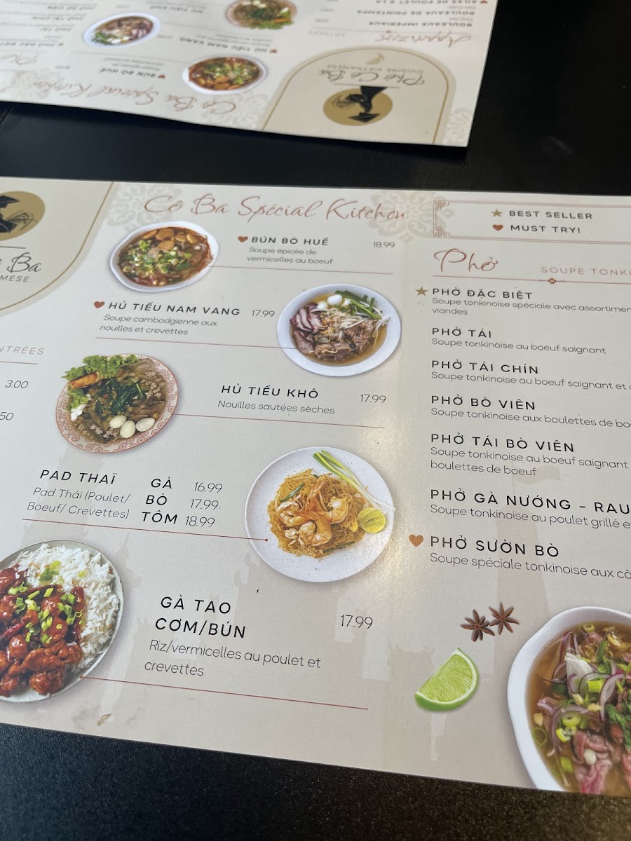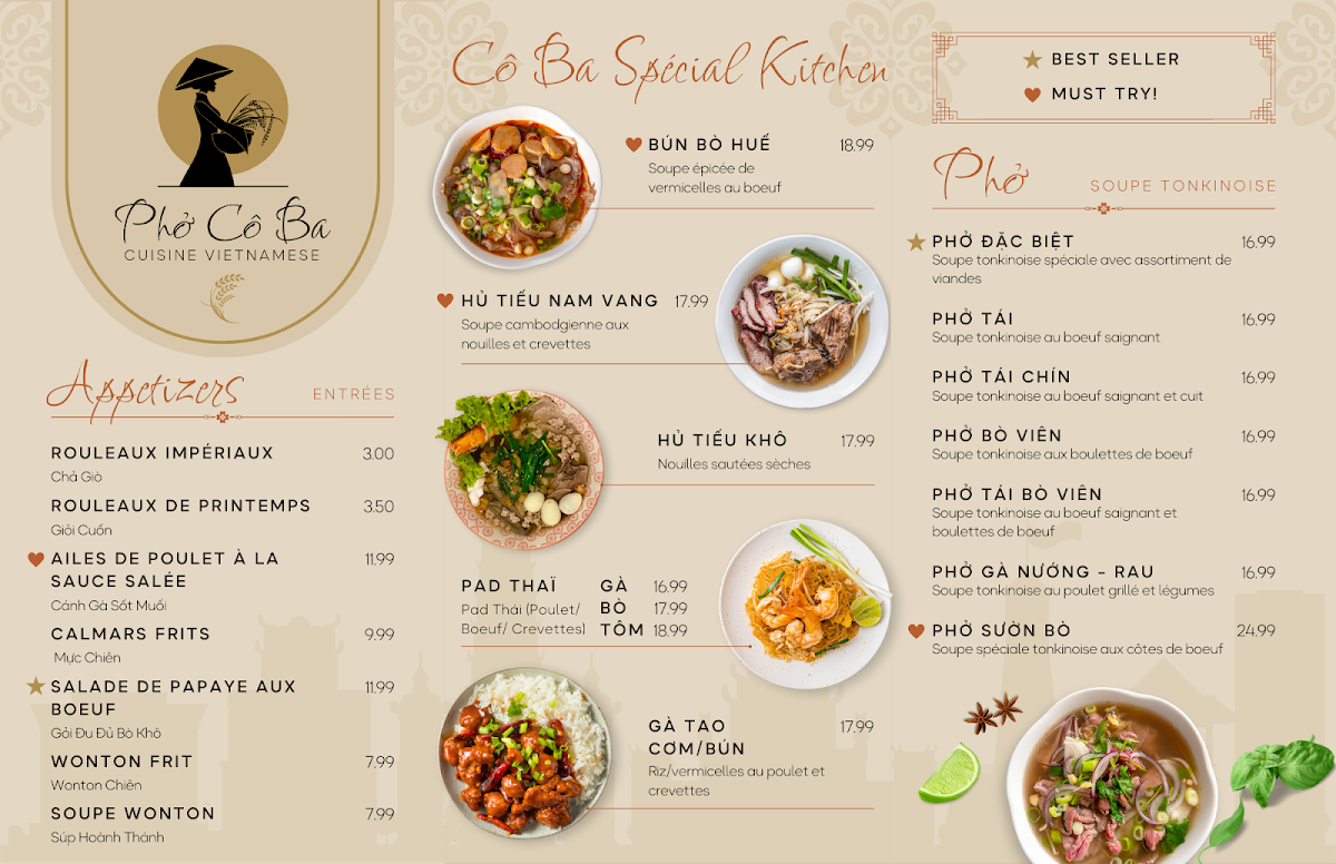 The menu is a culinary journey through Vietnam, presenting an array of signature dishes that cater to both classic and adventurous palates. Indulge in the Cô Ba Special Kitchen, featuring a delightful assortment like the Hủ Tiếu Khô with tender roast pork, calamari, shrimp, and wonton, all for just CA$19.99. For those who crave a kick of spice, the Bún Bò Huế, a hearty spicy vermicelli soup with beef, is sure to warm your soul. Or can’t decide? Try the exquisite Hủ Tiếu Nam Vang Soupe - a Cambodian-inspired noodle soup that rich in flavor, all at the same price.